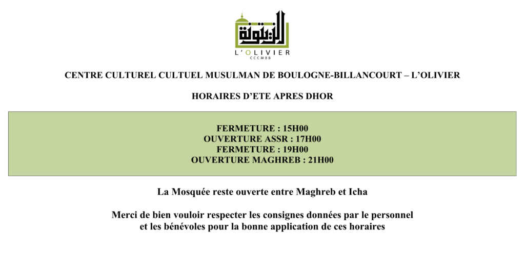 Horaires d’été après Dhor : FERMETURE : 15H00 OUVERTURE ASSR : 17H00 FERMETURE : 19H00 OUVERTURE MAGHREB : 21H00 La Mosquée reste ouverte entre Maghreb et Icha Merci de bien vouloir respecter les consignes données par le personnel et les bénévoles pour la bonne application de ces horaires