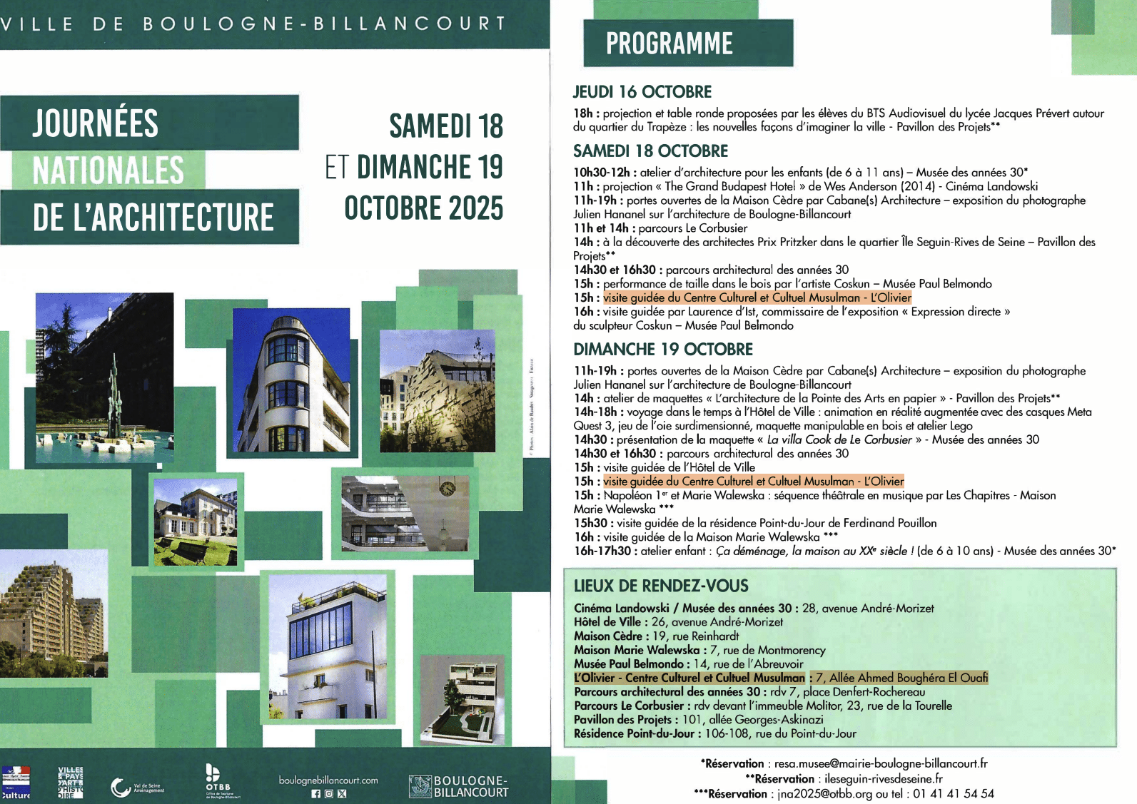 Signé par l’architecte Pierre-Louis FALOCI, Grand prix national de l’architecture en 2018, le Centre Culturel Cultuel Musulman de Boulogne-Billancourt, figure pour la première fois dans la programmation des Journées Nationales de l’architecture des samedi 18 et Dimanche 19 octobre 2025. Les visiteurs seront accueillis avec plaisir pour des visites guidées dès 15h00.
